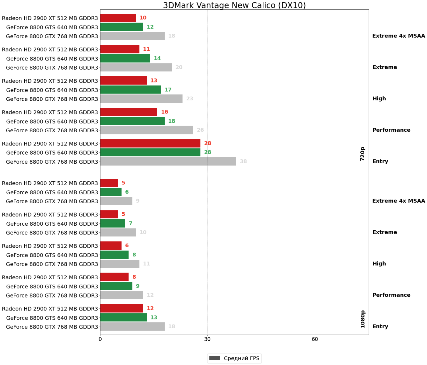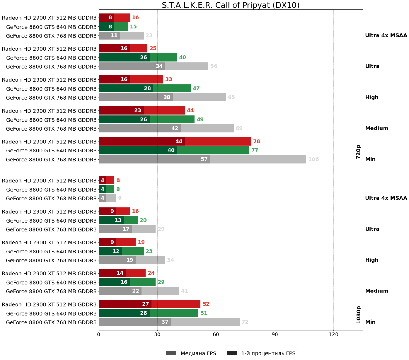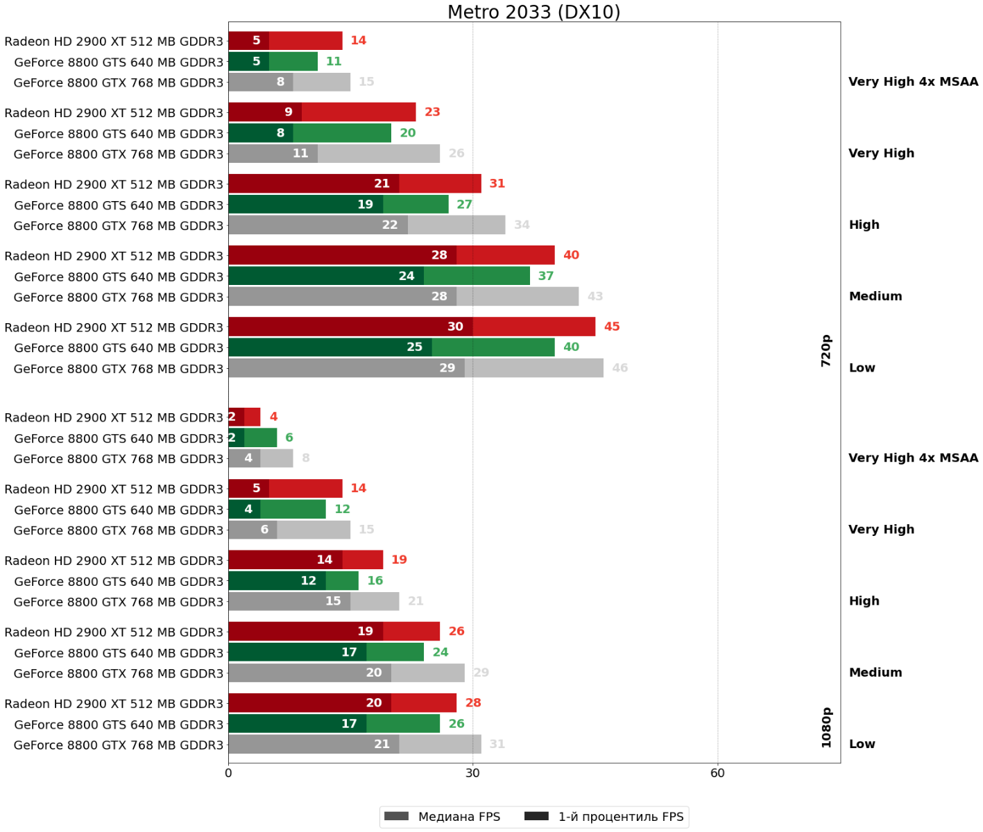 В оригинальной Metro 2033, где 8800 GTX был немного впереди, 8800 GTS уже отстаёт от HD 2900 XT.