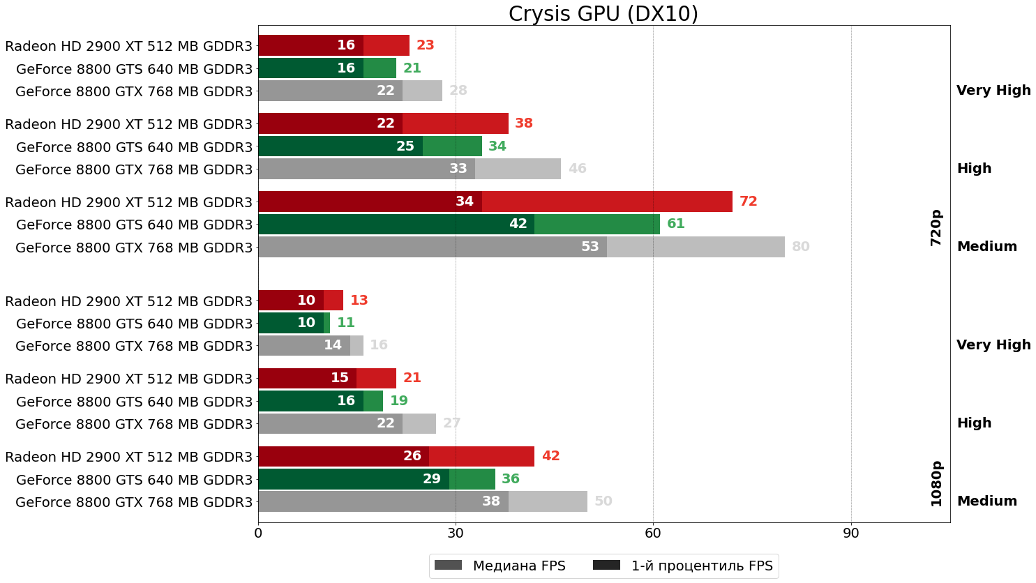 В Crysis, где HD 2900 XT проигрывал более дорогой 8800 GTX, в сравнении с прямым конкурентом 8800 GTS ускоритель ATI/AMD уже выходит однозначным победителем.