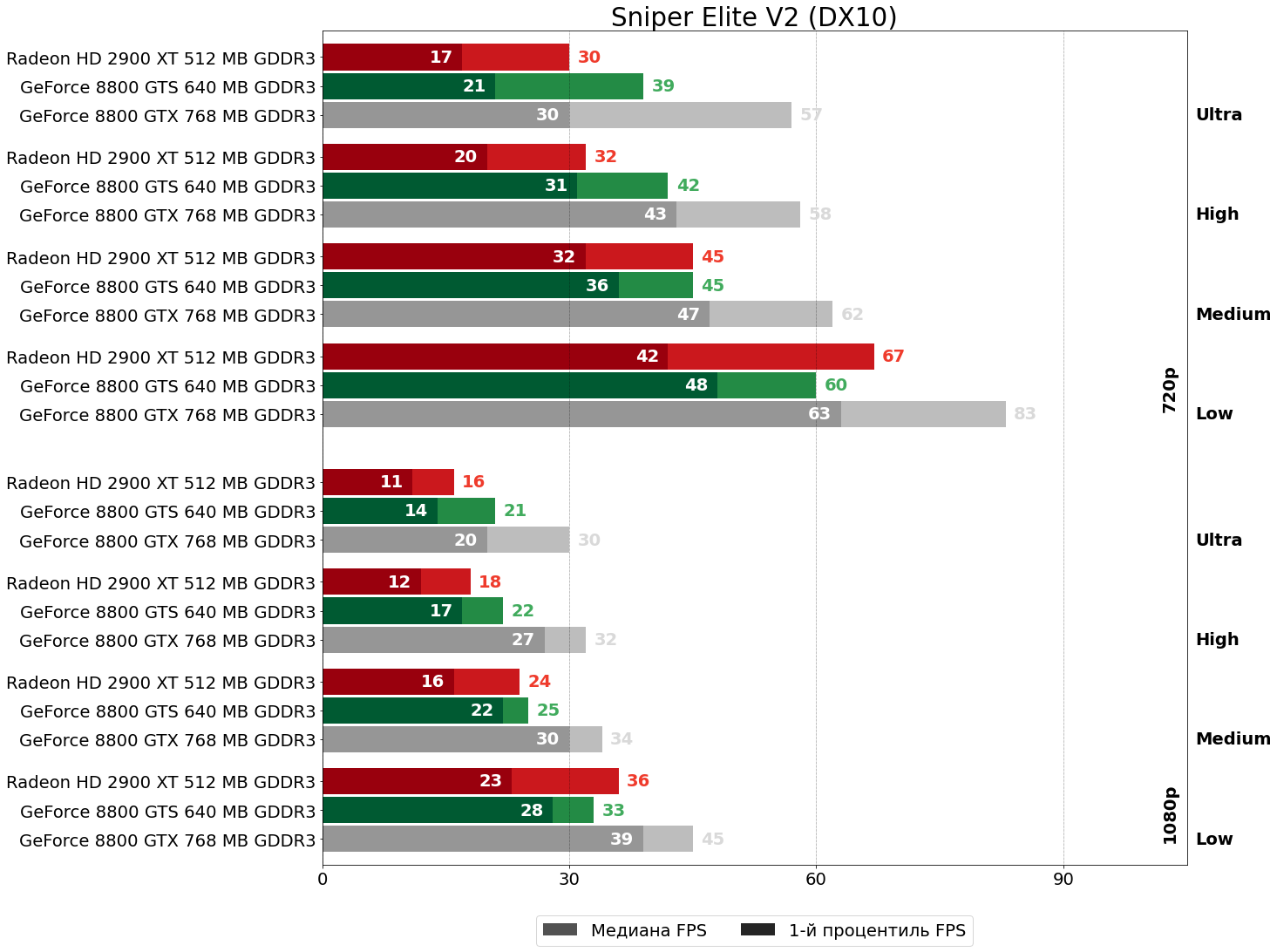 Во второй части Sniper Elite, напротив, дела для "красной" карты обстоят по-прежнему плохо — преимущество 8800 GTS над HD 2900 XT, конечно, не столь огромно да и проявляется не во всех режимах, как при сравнении с 8800 GTX, но всё ещё в целом внушительно.