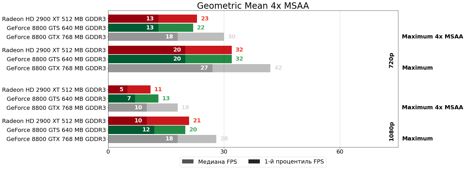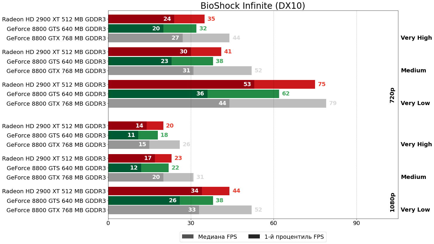 В BioShock Infinite ситуация ещё лучше — 8800 GTX здесь не так сильно отрывался от HD 2900 XT, а 8800 GTS уже значительно уступает ускорителю ATI/AMD.