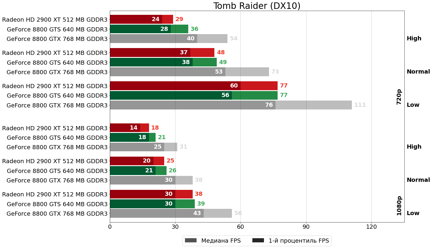 Мисс Крофт, так же однозначно предпочитавшая топовую карту NVIDIA, при выборе среди прямых конкурентов определиться толком так и не смогла — небольшое преимущество за 8800 GTS имеется лишь на максимальных настройках.