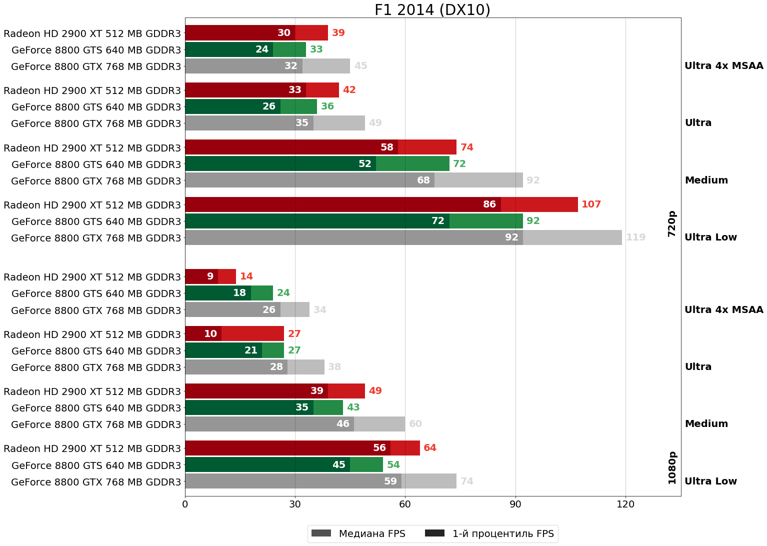Ну а королева автоспорта так вообще при сравнении с 8800 GTS однозначно симпатизирует HD 2900 XT вплоть до самого тяжёлого режима (ультра-настроек со сглаживанием в FHD-разрешении), где 8800 GTS резко вырывается вперёд.