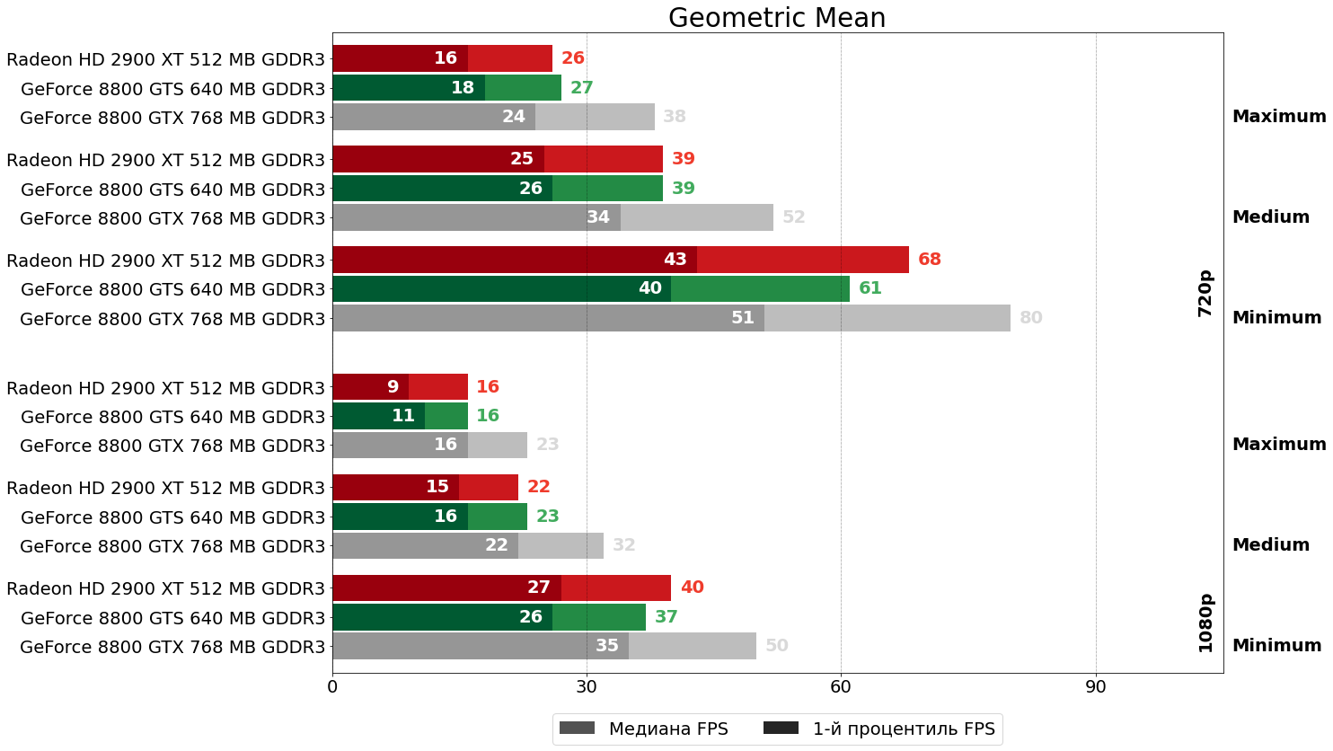 И, наконец, в GTA V чаша весов склоняется по-прежнему в сторону ускорителя NVIDIA — в большинстве вариантов настроек 8800 GTS всё же опережает HD 2900 XT.