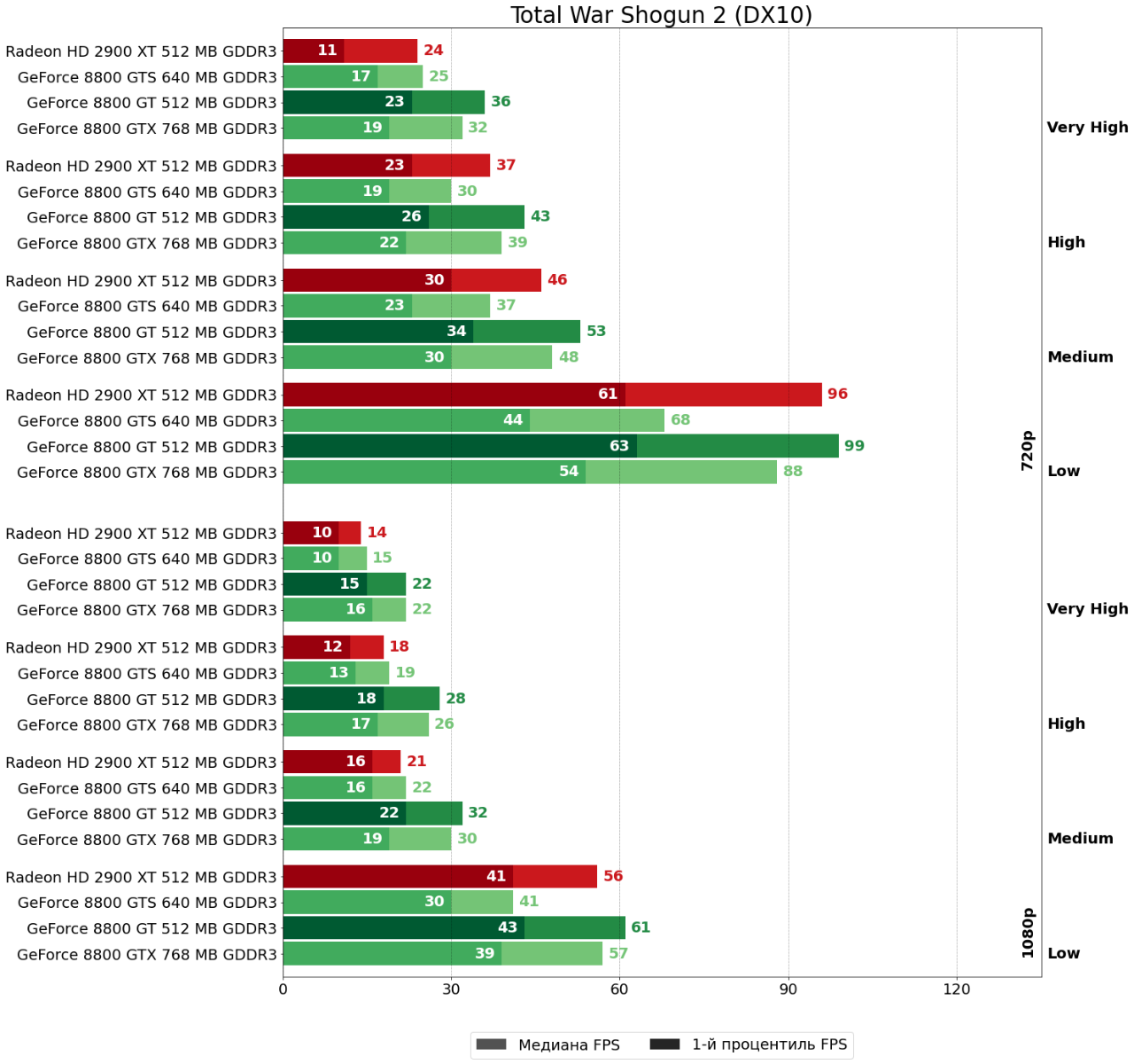 А в Total War Shogun 2 однозначно впереди новенькая (на конец 2007 года) GeForce 8800 GT.