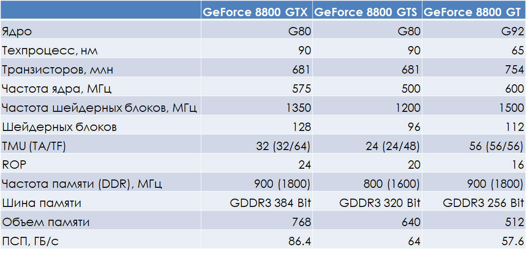 Блоки ROP, каждый из которых обрабатывал по-прежнему по четыре пикселя, так же не изменились, уменьшилось лишь их количество — в G80 их было 6, а в новом решении осталось всего 4. Такого количества блоков ROP на практике оказалось достаточно для актуальных на тот момент разрешений экранов, а себестоимость чипов удалось снизить. Кроме того, это позволило при лишь немного возросшем транзисторном бюджете перенести микросхему NVIO, ответственную за поддержку внешних интерфейсов, в сам чип. Скажем сразу, что ни переносом чипа NVIO в графический процессор, ни усложнением блоков TMU, ни вероятным увеличением кэшей при переходе на более узкую 256-битную шину объяснить всё-таки возросшее с 681 до 754 млн количество транзисторов было невозможно. С самого начала выглядело крайне вероятным, что G92 в составе GeForce 8800 GT всё же несколько урезан, так что чуть позже нас, возможно, ждёт выпуск более производительного решения на полноценном G92. Так в итоге и получилось, но об этом расскажем в другой раз.