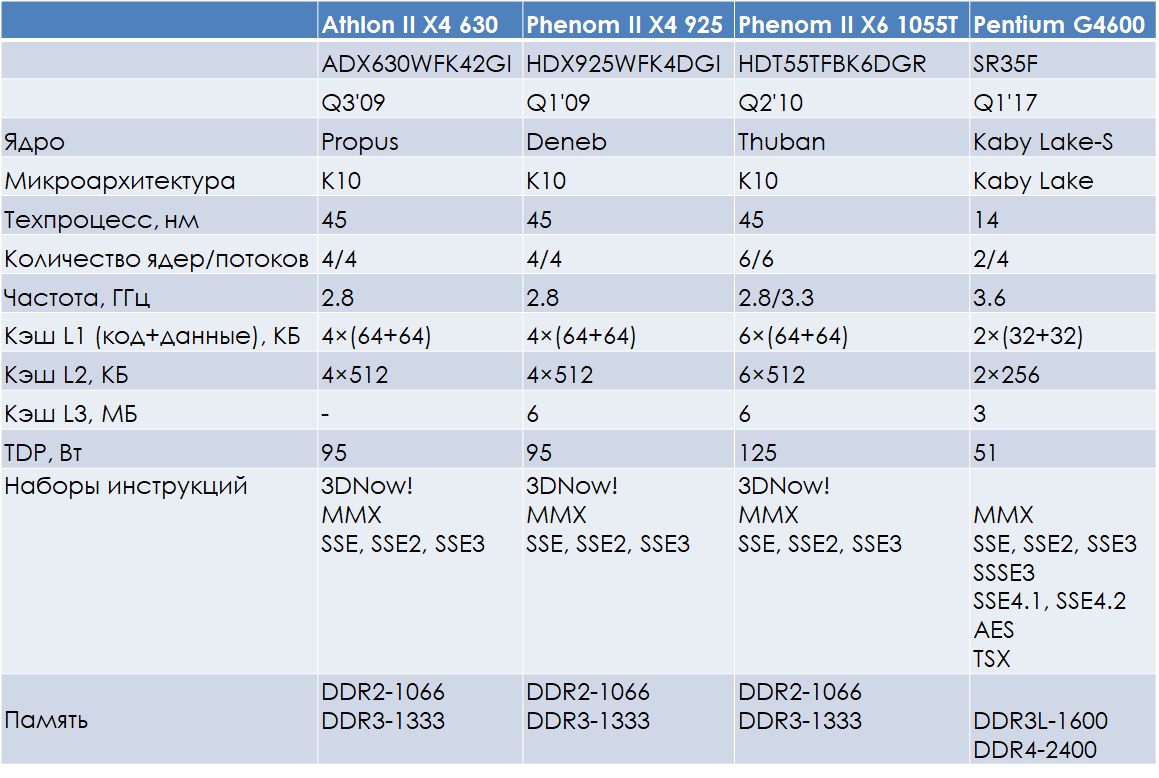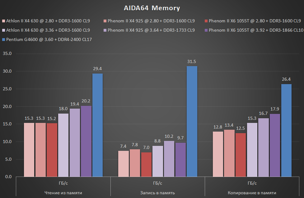Показатели представителей микроархитектуры K10 в тестах памяти не впечатляют — даже в комплексном разгоне (увеличение не только частоты процессора, но и контроллера памяти) процессоры AMD значительно отстают от G4600 со стоковой DDR4-2400 памятью. В тестах записи (и копирования) Phenom II X4 немного обходит равночастотный Athlon II X4, здесь, возможно, сказывается наличие у первого кэша L3. Результаты Phenom II X6 в тестах записи и копирования, однако, даже несколько хуже таковых у Athlon II X4, что, скорее всего, объясняется тем простым фактом, что архитектурно идентичному контроллеру памяти в 6-ядерном процессоре приходится обслуживать на 50% больше ядер.