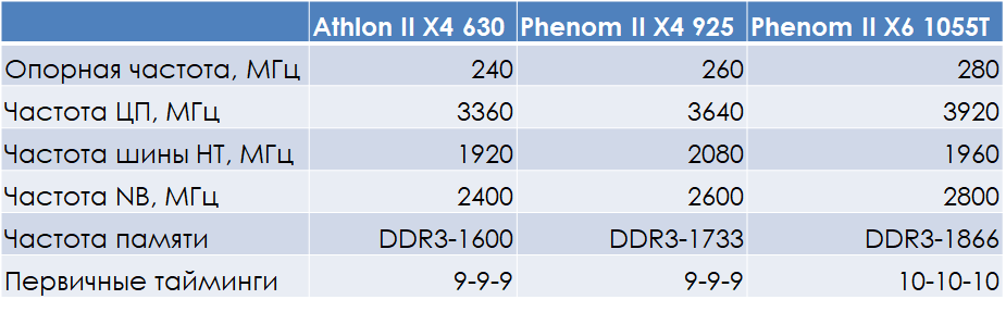 Процедура разгона на платформе AM3 принципиально ничем не отличалась от описанной ранее для AM2+, за исключением, естественно, результирующих частот работы модулей памяти. Процессоры AMD показали разный разгонный потенциал: Athlon II X4 630 покорил планку лишь в 240 МГц "по шине", Phenom II X4 925 — в 260 МГц, а Phenom II X6 1055T показал ещё лучше, одолев 280 МГц "по шине" и почти добравшись до заветных 4 ГГц по частоте ядер.