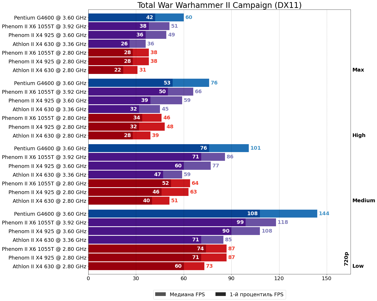 Похожую на GTA V картину производительности можно видеть и в популярной стратегии Creative Assembly, по крайней мере, в режиме боя (Battle Benchmark), в котором игра неплохо масштабируется по потокам. По средним показателям "гиперпень" всё же немного впереди разогнанного Phenom II X6, но преимущество незначительно. 4-ядерные процессоры Phenom II и Athlon II вновь выступают заметно хуже независимо от уровня настроек графики. Ультра-настройки вновь можно себе позволить и на "гиперпне" и на процессорах из прошлого, последние, правда, желательно немного разогнать.