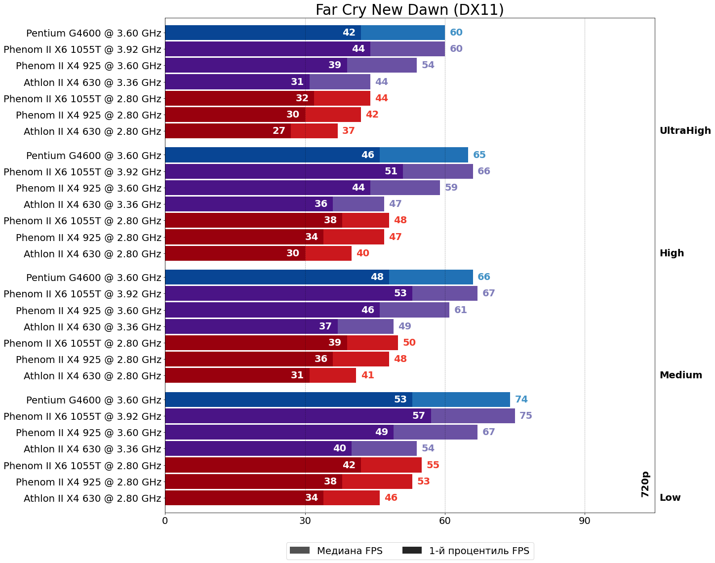 Несмотря на использование "старой" версии API DirectX, игра Ubisoft демонстрирует поведение, близкое к вышеописанному у современных DirectX 12 игр. Да, прирост от пары дополнительных ядер в Phenom II ниже, да и наблюдается почти паритет 6-ядерного "старичка" в разгоне с "гиперпнём", но первый всё же впереди. Ультра-настройки в Far Cry New Dawn менее требовательный к производительности центрального процессора — стабильные 30 FPS тут смогли обеспечить почти все участники даже на стоковых частотах.