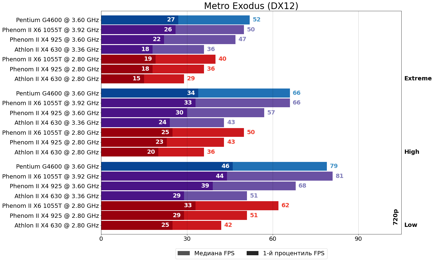 В последней на данный момент части Metro, ситуация несколько нестандартная — несмотря на использование DirectX 12, от наличия двух дополнительных ядер K10 независимо от настроек графики подрастает в первую очередь именно средняя производительность, а не стабильность времени кадра. В разгоне Phenom II X6 идёт с "гиперпнём" "ноздря в ноздрю" так же на всех протестированных настройках. Ультра-настройки в этой игре дались участникам тестирования ещё с большим трудом, чем в Shadow of the Tomb Raider и Hitman 2 — до абсолютно стабильных 30 FPS недотянул никто, хотя "гиперпень" и 6-ядерный Phenom в разгоне подошли к заветной отметке максимально близко.