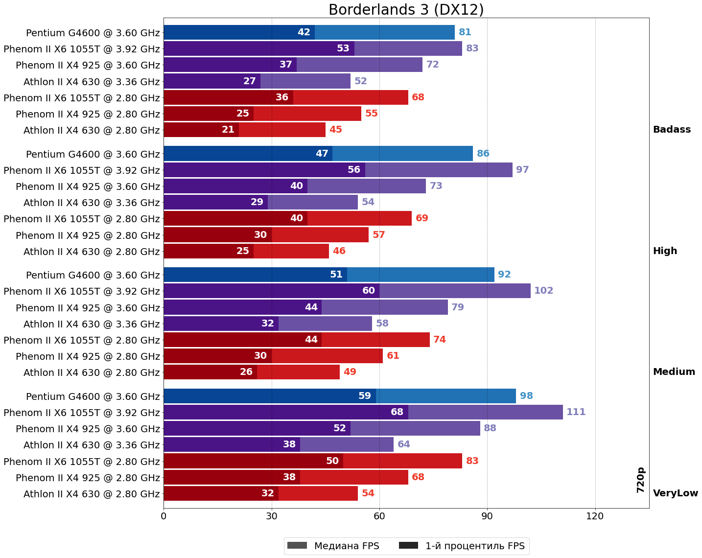 И, наконец, в Borderlands 3 вновь наблюдаем типичную для DirectX 12 проектов картину — производительность 6-ядерного Phenom II заметно выше 4-ядерного собрата, а наличие кэша L3 менее важно. "Гиперпень" вновь повержен 6-ядерником в разгоне на всех вариантах графических настроек. Ультра-настройки для участников тестирования опять же не приговор, как минимум в разгоне.