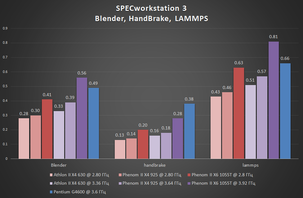- Рендеринг в Blender, как известно, хорошо масштабируется на большое количество потоков, но IPC и частоты современных процессоров значительно выше. так что на стоковых частотах производительности даже 6 ядерного Phenom II всё ещё недостаёт для борьбы даже с 2-ядерным 4-поточным "гиперьпнём". В разгоне Phenom II X6 уже способен обойти указанного современного конкурента, а вот остальные участники забега всё ещё остаются позади.