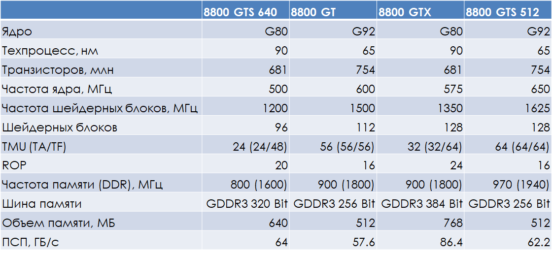 Сравнение с первой версией GeForce 8800 GTS, оснащённой 640 МБ памяти, также однозначно в пользу обновлённого 65-нм продукта — при значительно более высокой производительности, новенький GeForce 8800 GTS даже на старте продаж стоил примерно столько же, сколько и старая версия. И здесь, безусловно, стоит ещё раз пожурить компанию NVIDIA за порочную практику выпуска и продажи различных ускорителей под одним и тем же маркетинговым названием. Даже если на секунду забыть о существовании ещё двух вариантов GeForce 8800 GTS (на G80 c 320 МБ памяти и на урезанном G92 с 512 МБ) в конце 2007 года выбор между GeForce 8800 GTS 640 и GeForce 8800 GTS 512 был неочевиден технически неподкованному покупателю — при примерно одинаковой стоимости первый вариант имел даже больше памяти, вот только был значительно медленнее в играх! А такие сюрпризы, очевидно, не есть хорошо.