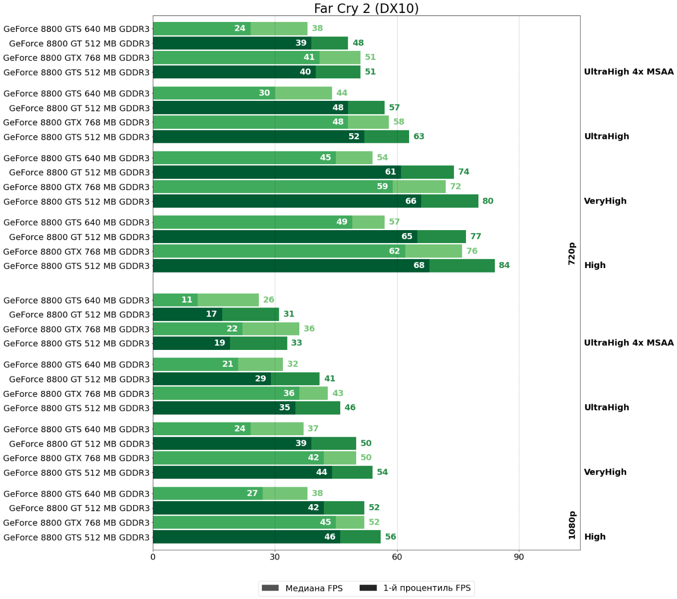 В Far Cry 2 GeForce 8800 GTS 512 так же впереди за исключением ультра-настроек в FHD, где старичку GeForce 8800 GTX, по всей видимости, наконец-таки пригодились и более широкая шина памяти, и больший её объём, и большее число блоков ROP.
