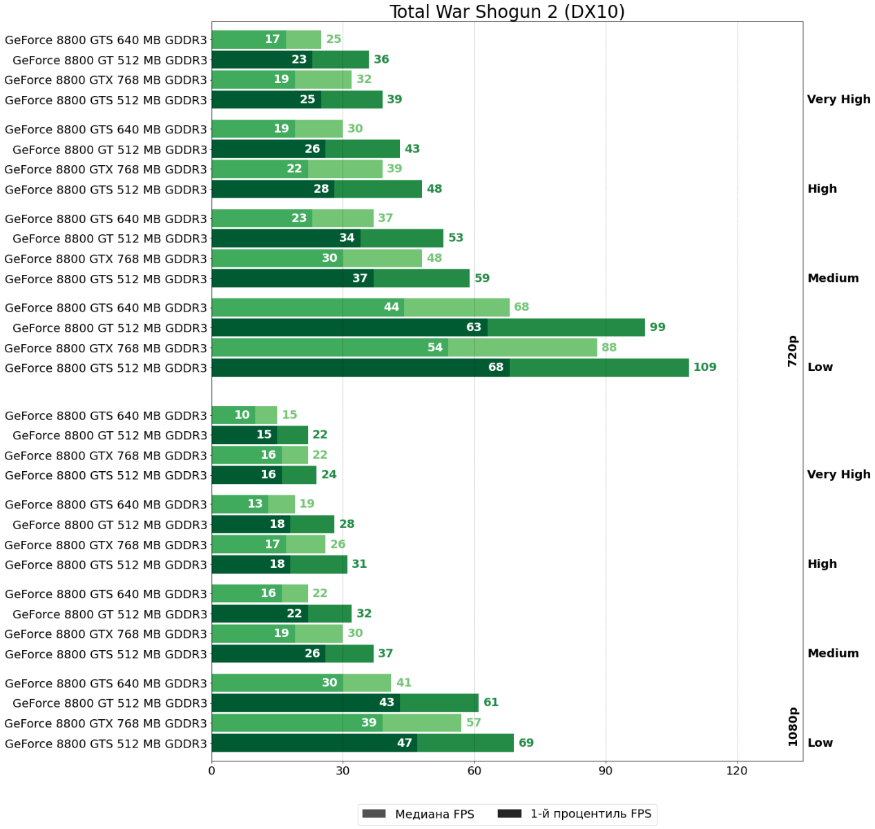 А в Total War Shogun 2 вновь однозначно впереди GeForce 8800 GTS 512 — "грубая сила" вновь оказалась важнее архитектурных преимуществ.