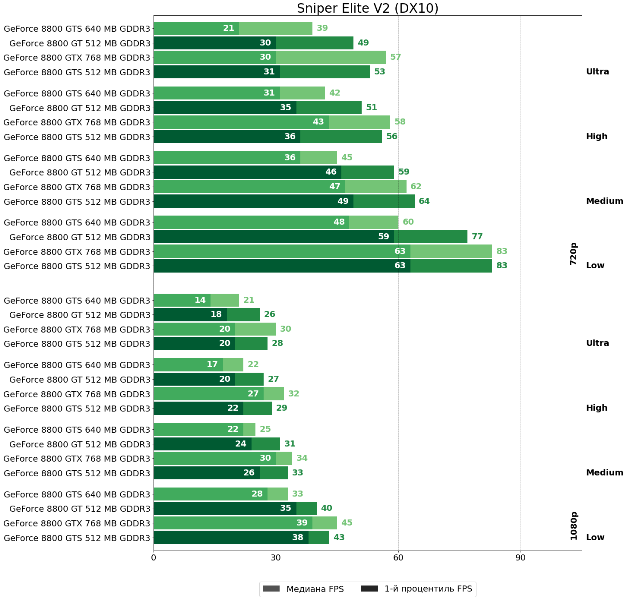 В Sniper Elite V2, напротив, GeForce 8800 GTS 512 отстаёт от GeForce 8800 GTX, пускай и немного.