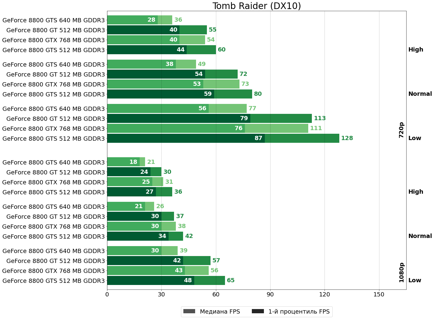 Аналогичная картина и в первой части перезапуска игр, посвящённых приключениям Лары Крофт — GeForce 8800 GTS 512 достаточно более высоких тактовых частот, чтобы обойти GeForce 8800 GTX.