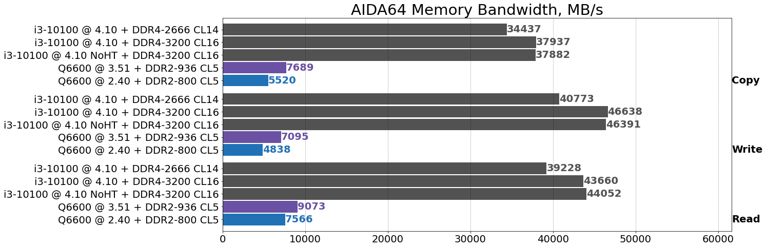 По пропускной способности DDR4-3200 CL16 действительно немного впереди DDR4-2666 CL14 при практически идентичной латентности. Вопрос лишь в том, будет ли толк от такого преимущества в приложениях и играх? HT на скоростные показатели памяти ожидаемо не влияет.