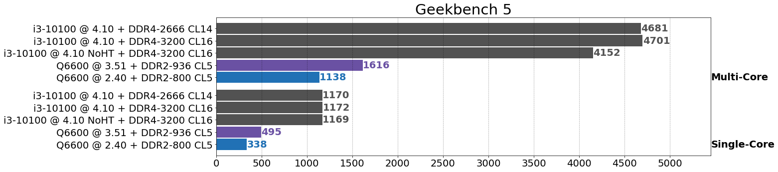 И уже в Geekbench 5 начинаем получать отчасти ожидаемые ответы на поставленные вопросы — никакого заметного преимущества от использования DDR4-3200 CL16 в сравнении с DDR4-2666 CL14 памятью система с Core i3-10100 не получила. А отключение HT повлияло исключительно на многопоточную производительность, которая упала на 12%. Но то "синтетика", а как дело обстоит в реальных приложениях и играх?