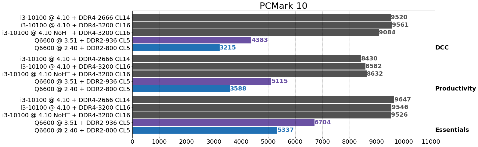 В комплексном тесте PCMark 10 единственная существенная разница наблюдается в тестах профессионального ПО для создания контента (Digital Content Creation, DCC) — здесь отключение HT снижает показатели Core i3-10100 на 5%. А какую память использовать — DDR4-3200 CL16 или DDR4-2666 CL14 — без разницы.