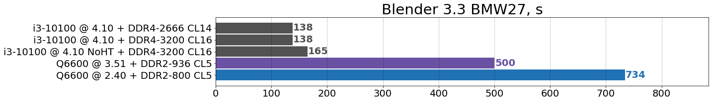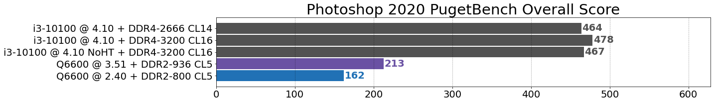 По группе профессионального ПО без труда заметна разница от HT практически везде за исключением Photoshop. В среднем отключение HT снижает показатели Core i3-10100 на 18%. А вот разницы в производительности с DDR4-3200 CL16 памятью в сравнении с DDR4-2666 CL14 практически нет.