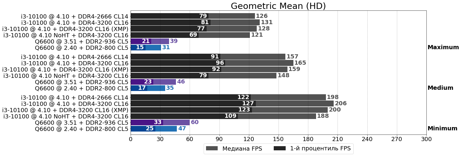 - Использование DDR4-2666 CL14 памяти с Core i3-10100 практически не оказывает влияние на игровую производительность в сравнении с DDR4-3200 CL16 памятью.
