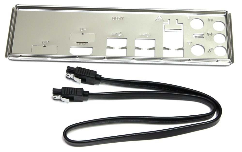 Комплект поставки почти отсутствует. Есть заглушка задней панели и один кабель SATA. Есть ещё какая-то цветная китайская карточка типа теста ОТК и всё.