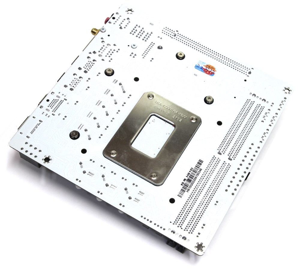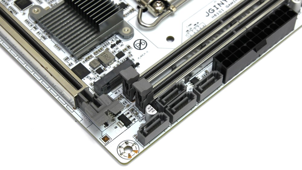 С первого взгляда понятно, что это какая-то упрощённая версия потому, что многие привыкли видеть на таких устройствах сложные системы охлаждения, и второй ярус с дочерней платой под процессорным сокетом и над слотом PCI-e x16. Здесь ничего этого нет, но есть ряд других интересных решений. Плата компактная и поэтому свободного места тут маловато. Кстати, мне понравилось, что печатная плата белая, а радиаторы серебристые, но это уже личные предпочтения, которые не всем придутся по вкусу.
