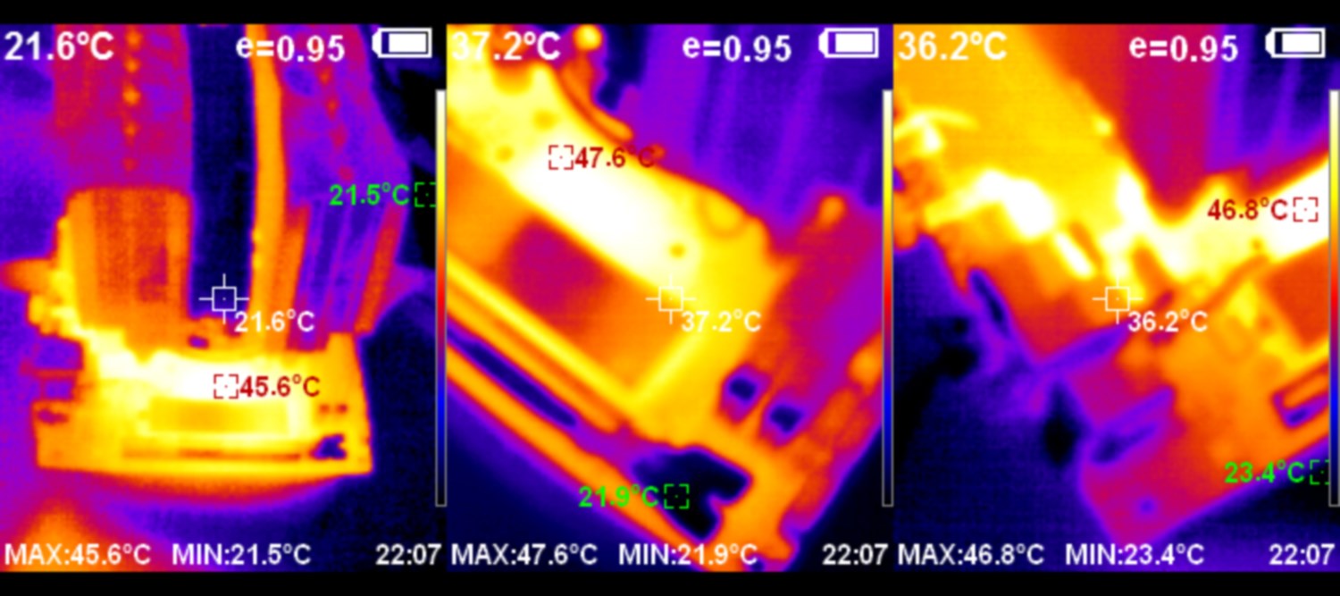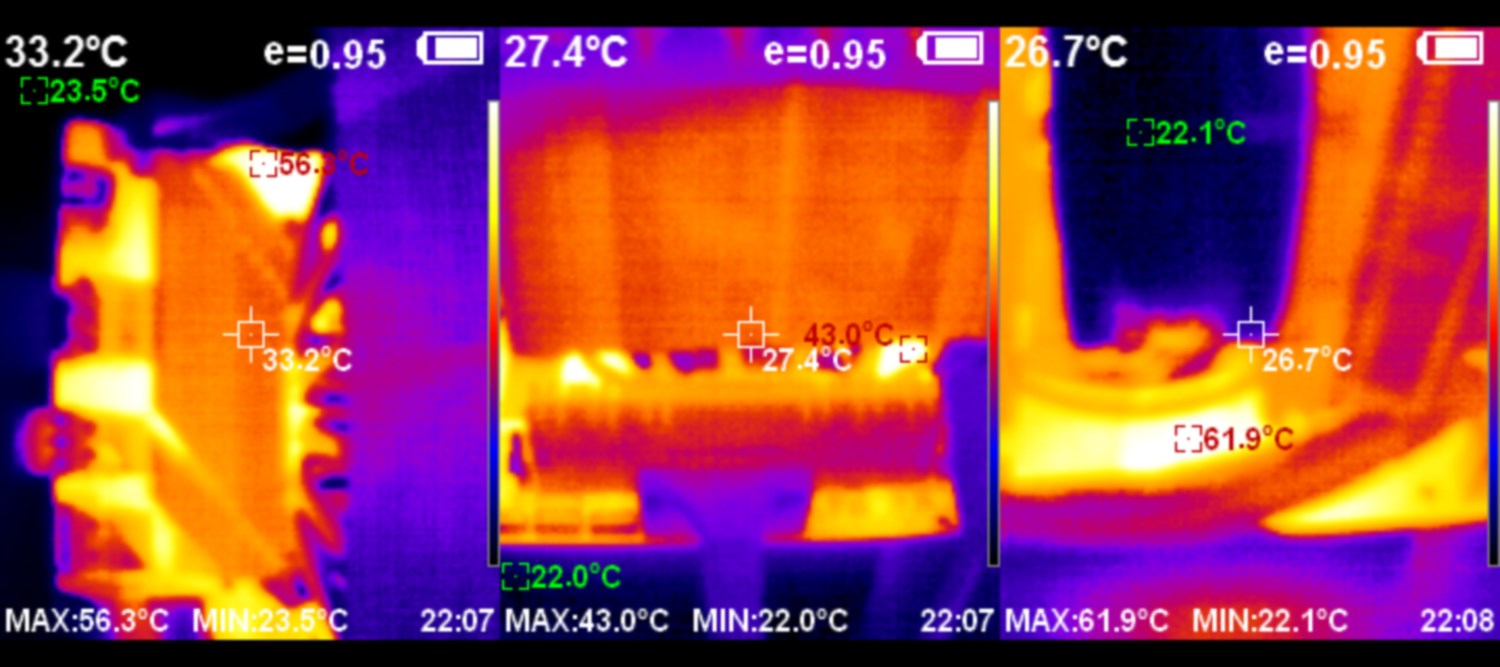 Сверху температура доходит до 65С, а сбоку спасает радиатор.