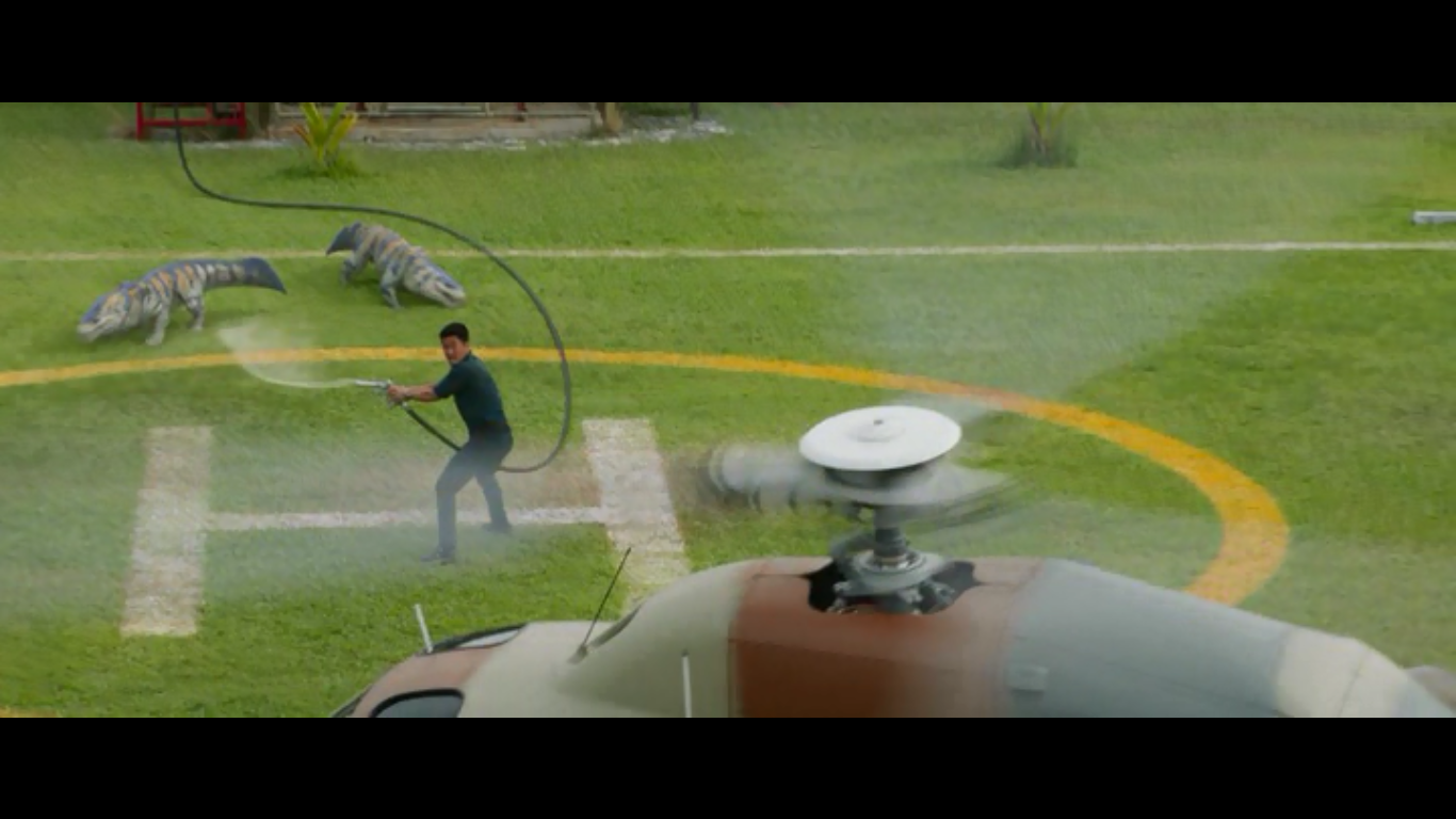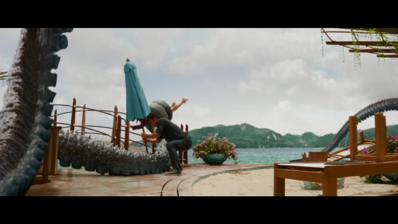 Это из-за зависти к франшизе "Парк Юрского периода"? Выглядит просто по-идиотски. Даже наемники, вооруженные автоматами, ничего не могут с ними сделать! Думаете, это монстры размером с тиранозавра? Как бы не так. Но и это не все. Частью купающихся закусывает гигантский спрут!