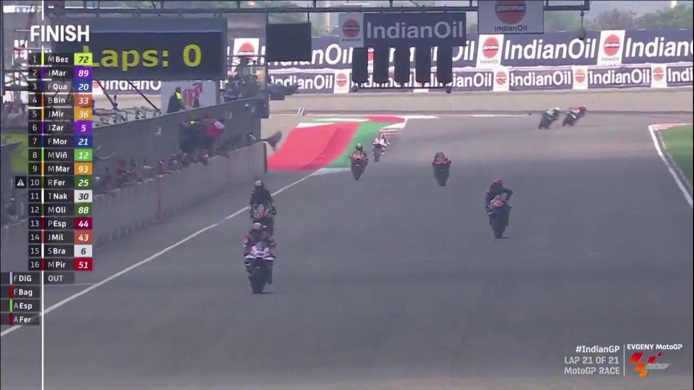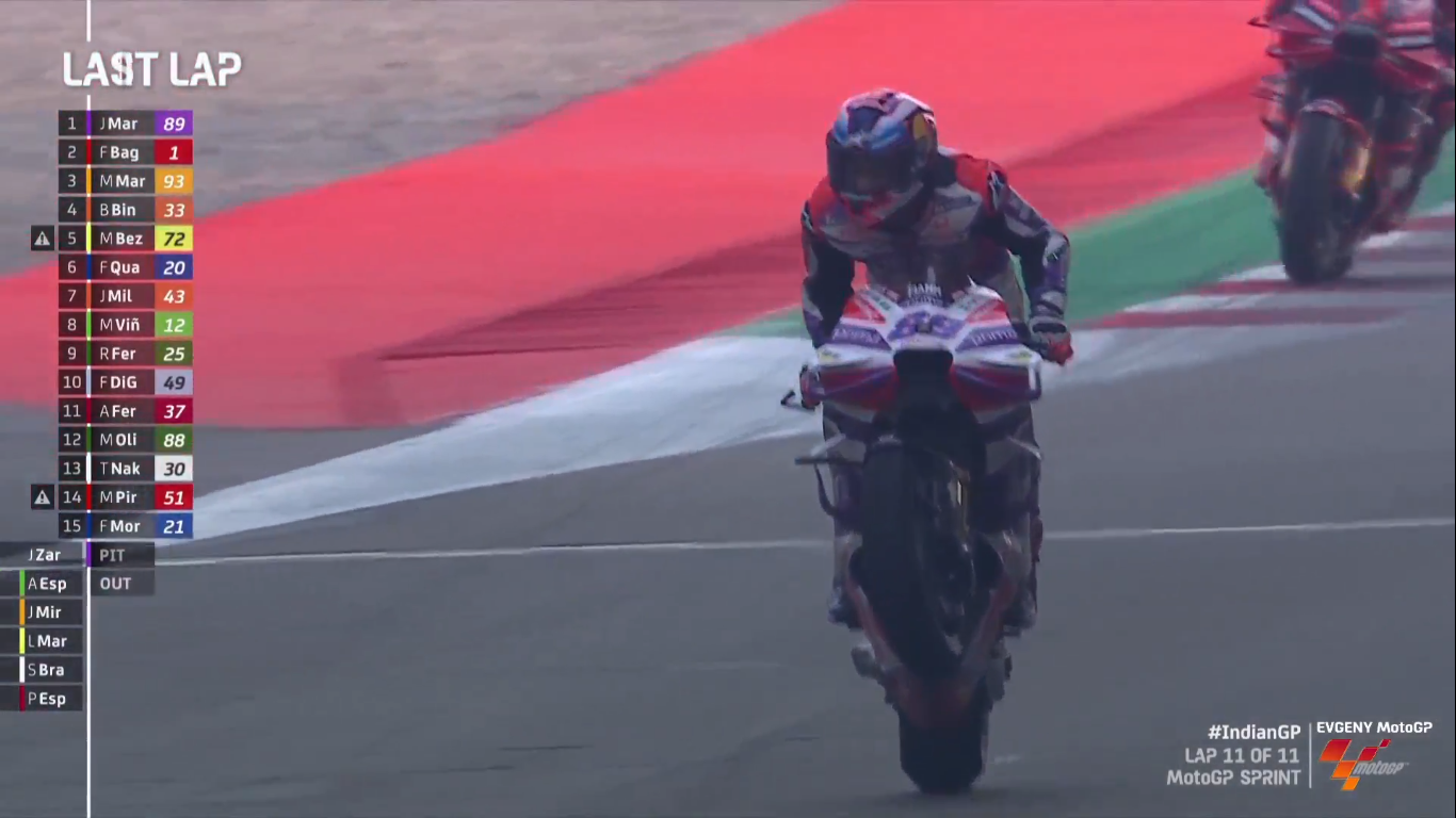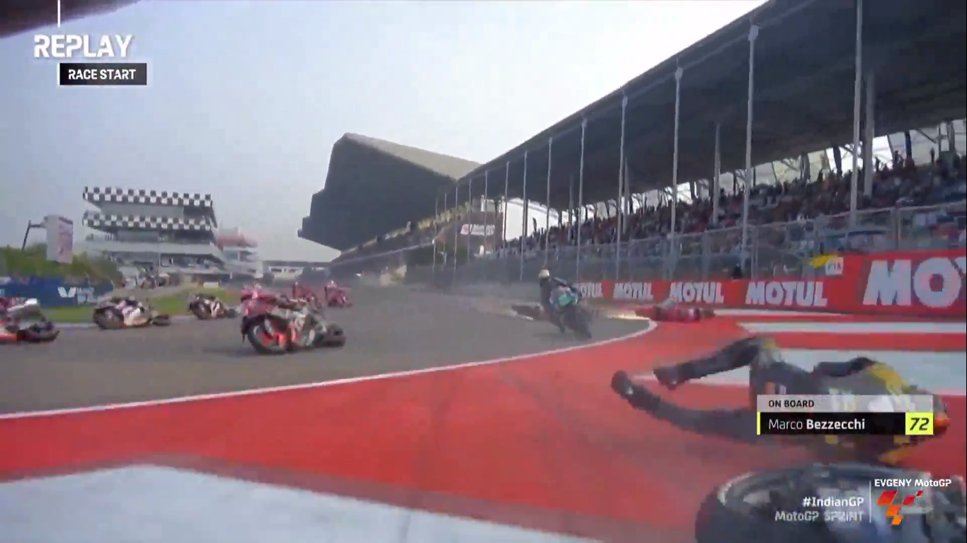 MotoGP. Гран-при Индии. В квалификации очень неплохо смотрелись представители всех команд на Ducati. Поул взял Марко Беццекки из VR46. На втором месте обосновался его соперник по чемпионату, Хорхе Мартин (Pramac Ducati). Ну, а третьим, со старта в гонку отправлялся лидер чемпионата, Франческо Баньяйя на заводской Ducati. Спринт переносили 4 раза из-за тропического ливня. Но на первом же повороте, напарник Беццекки, Лука Марини, выбивает его!