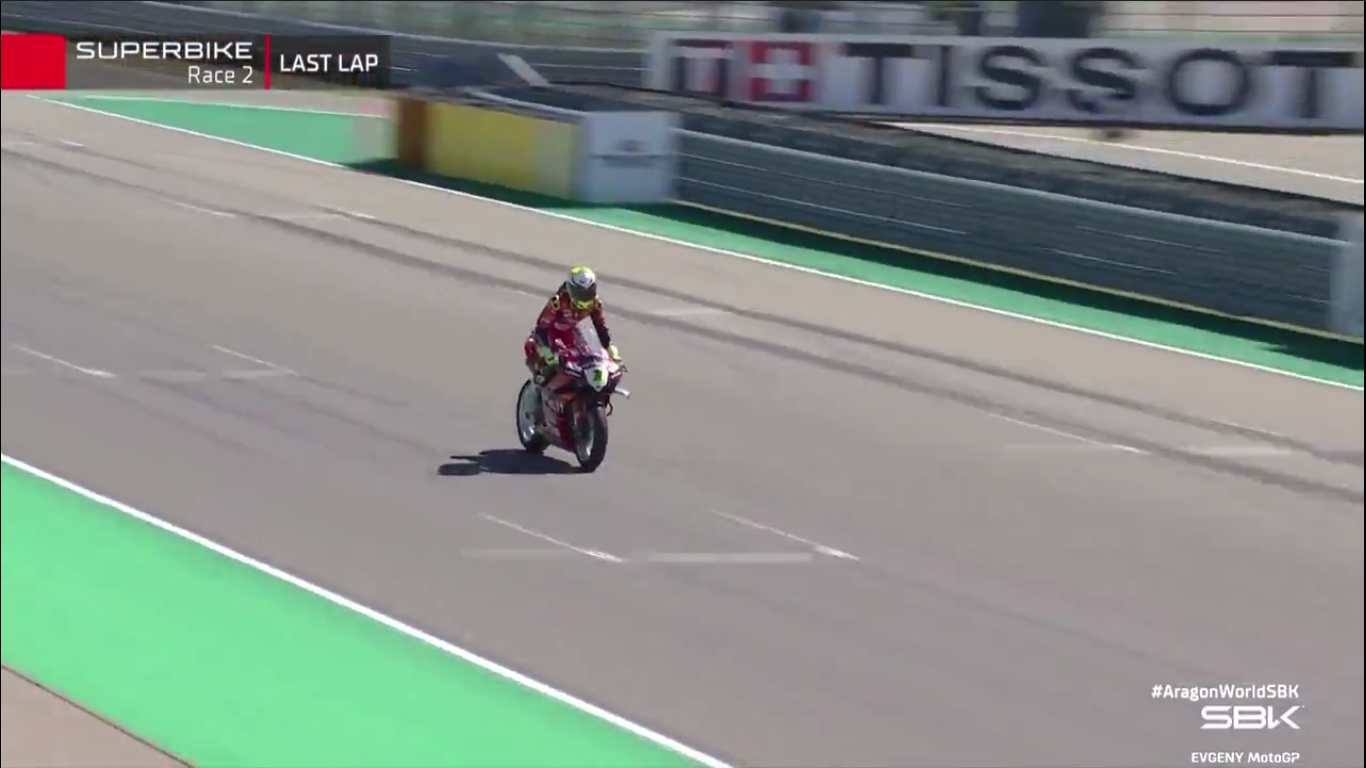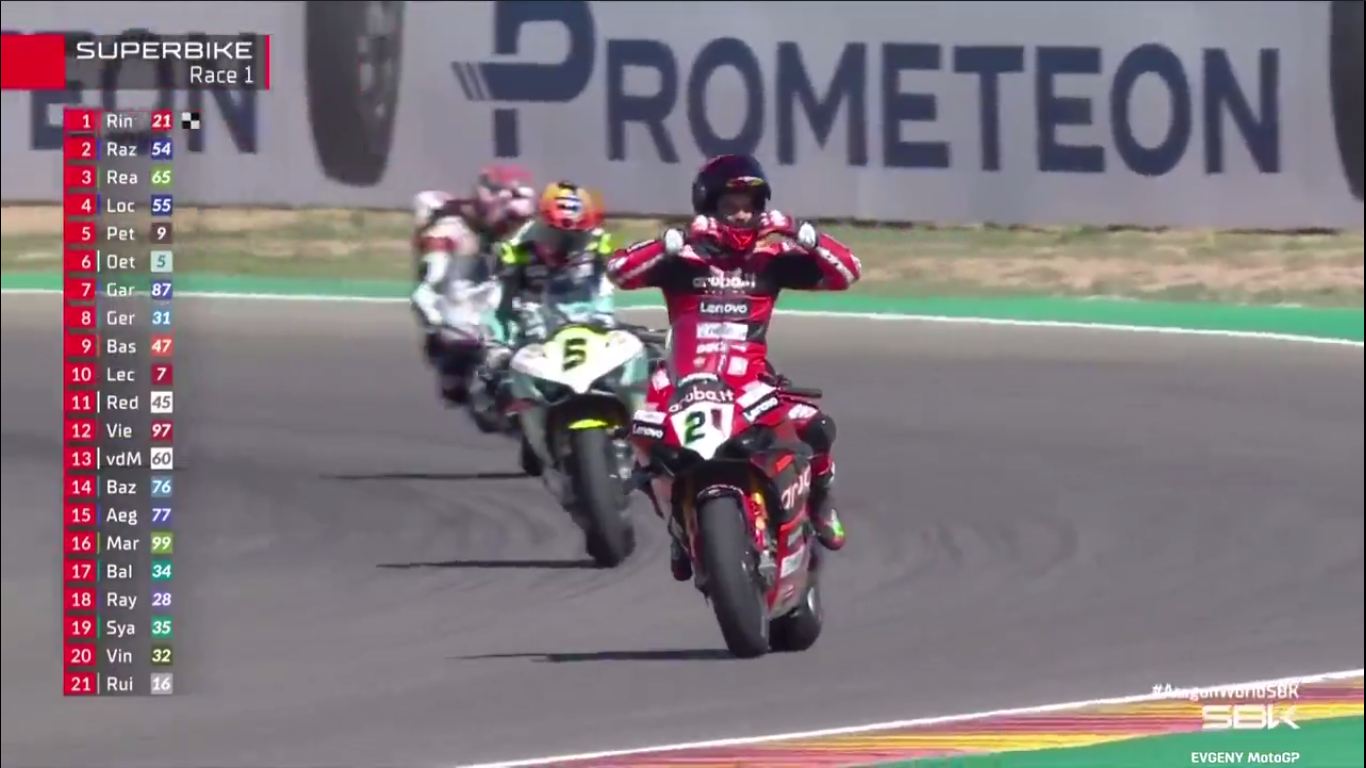 WSBK. Арагон. В первой гонке падает лидер чемпионата Альваро Баутиста и открывает путь к победе Джонотану Рею (Kawasaki) и Топраку Разгатлиоглу (Yamaha). Которые сцепились в борьбе за первое место. Но сзади к ним постепенно подъехал второй пилот Ducati, Майкл Рубен Ринальди. Подъехал и "скушал" соперников одного за другим, выйдя в лидеры гонки.