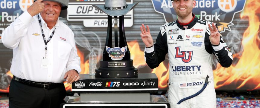 Байрон уходил с третьего места в финальном рестарте, чтобы в конечном итоге одержать победу на 1,863 секунды, опередив Росса Честейна из Trackhouse Racing, и автоматически претендовать на путевку в 8-й раунд плей-офф, который начнется через три недели.