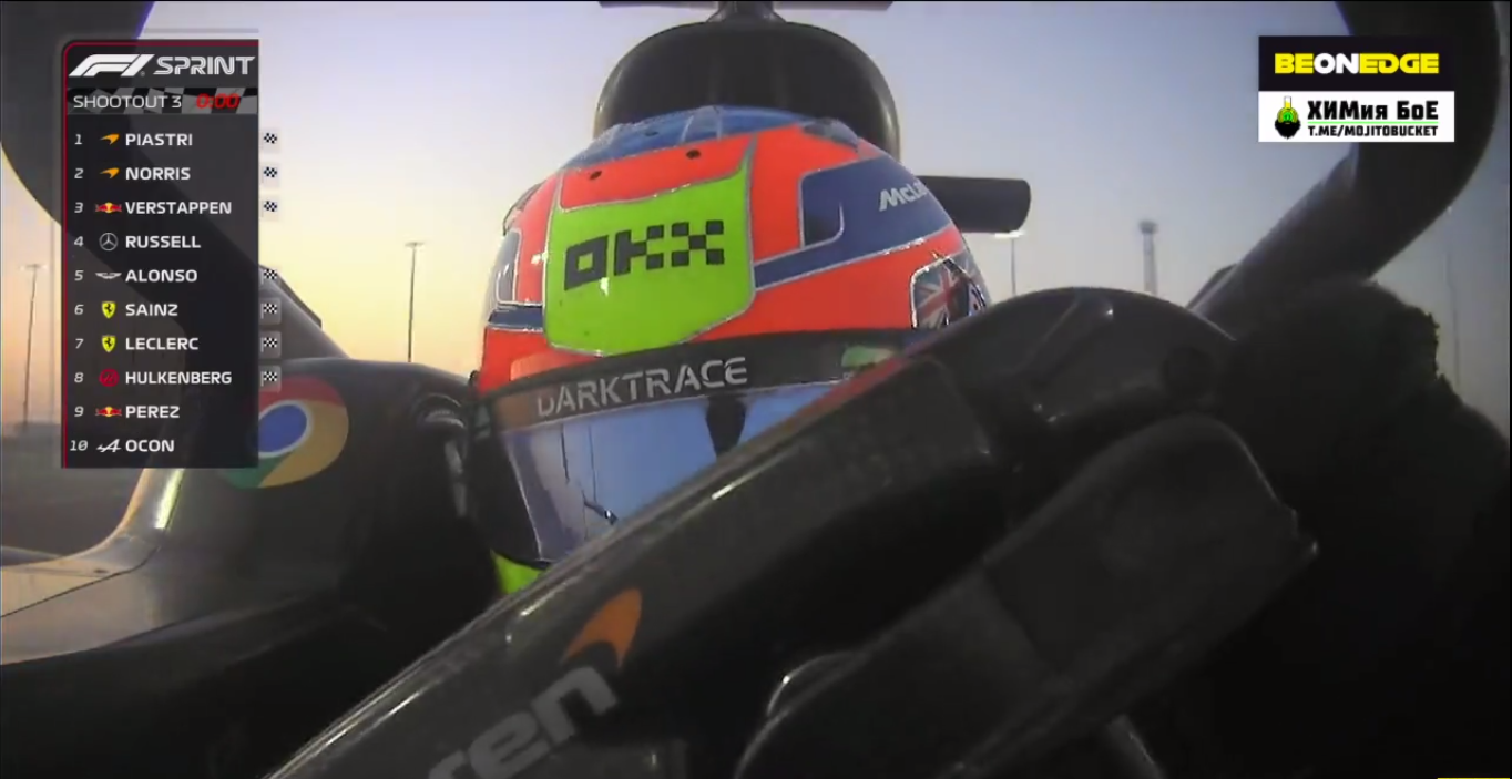 Квалификация к спринту проходила уже на трассе с несколько измененными поворотами, чтобы избежать разрушение шин. Трасса условно "новая", да еще и грязная. Масса выездов за пределы трассы, сделали квалификацию абсолютно не предсказуемой. Именно такой, а не интересной. В итоге, поул взял Оскар Пиастри (McLaren), что, естественно, не отражает реального положения вещей.