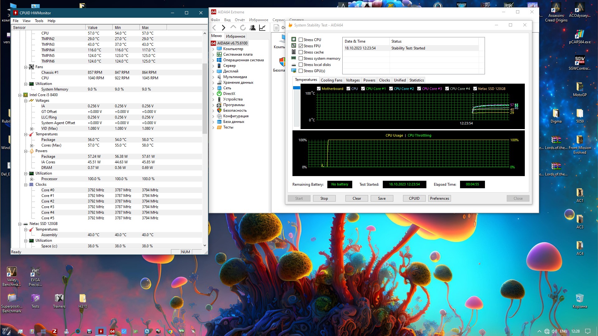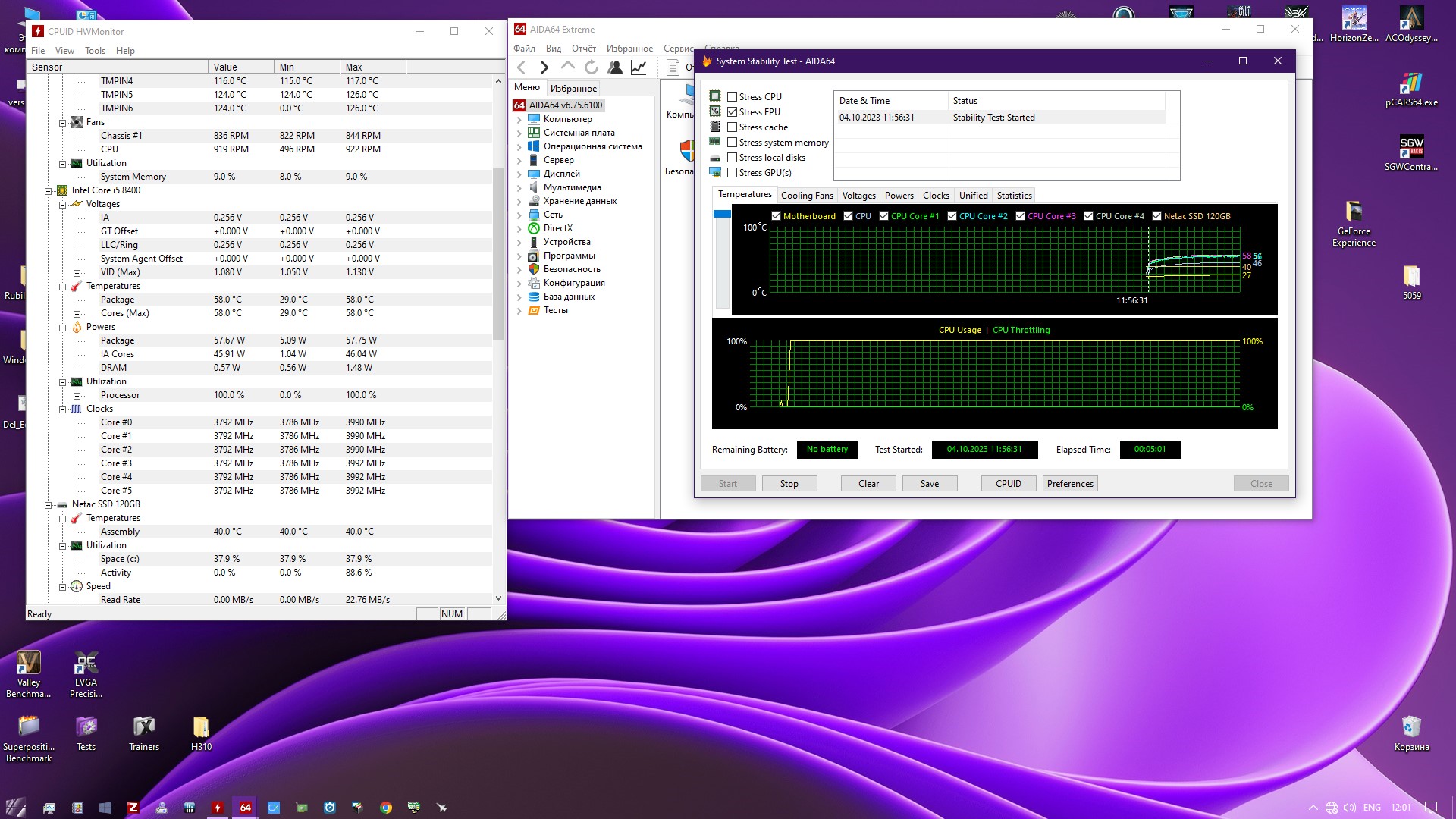 58 градусов при 1040 оборотах. И самая низкая температура на подсистеме питания - 56 градусов.