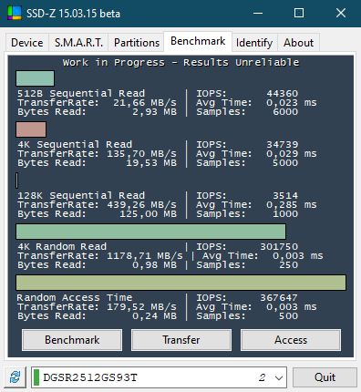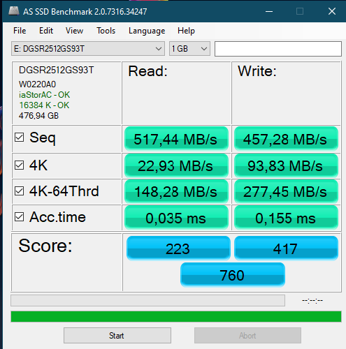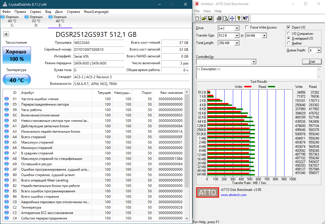 Приступаем к тестированию. ССД определился в системе, смотрим на его показатели: