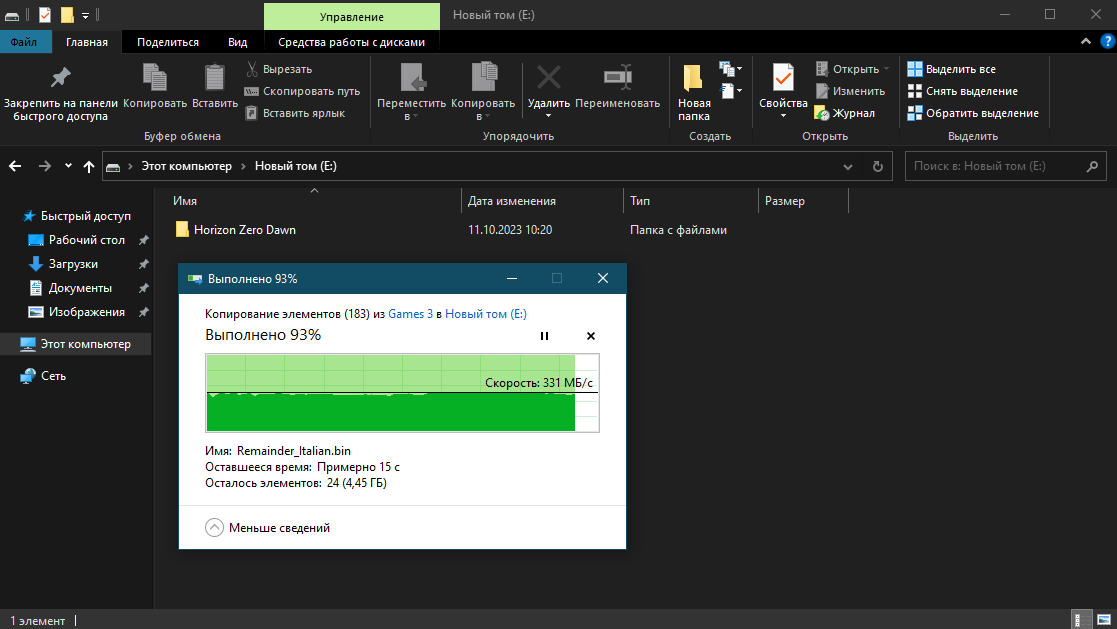 А теперь тест на перекидывание папки на накопитель. Это папка с игрой, объемом около 71 Гб.