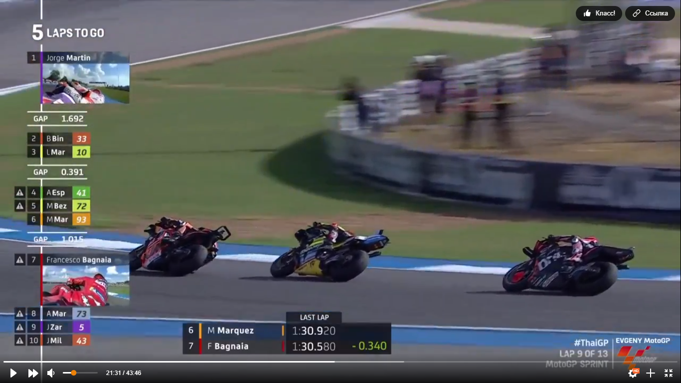 MotoGP. Таиланд. Опять очень жарко. Претендент на титул, Хорхе Мартин без особых проблем выигрывает поул. В то время как Франческо Баньяйя в очередной раз выступил не очень - 6 место на старте.