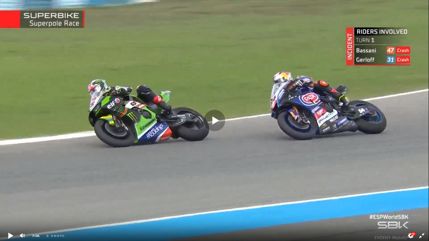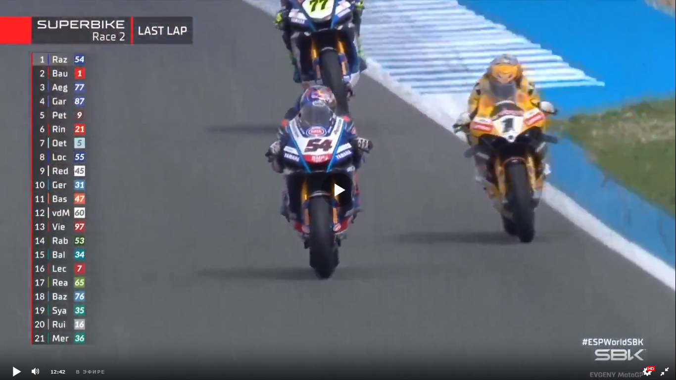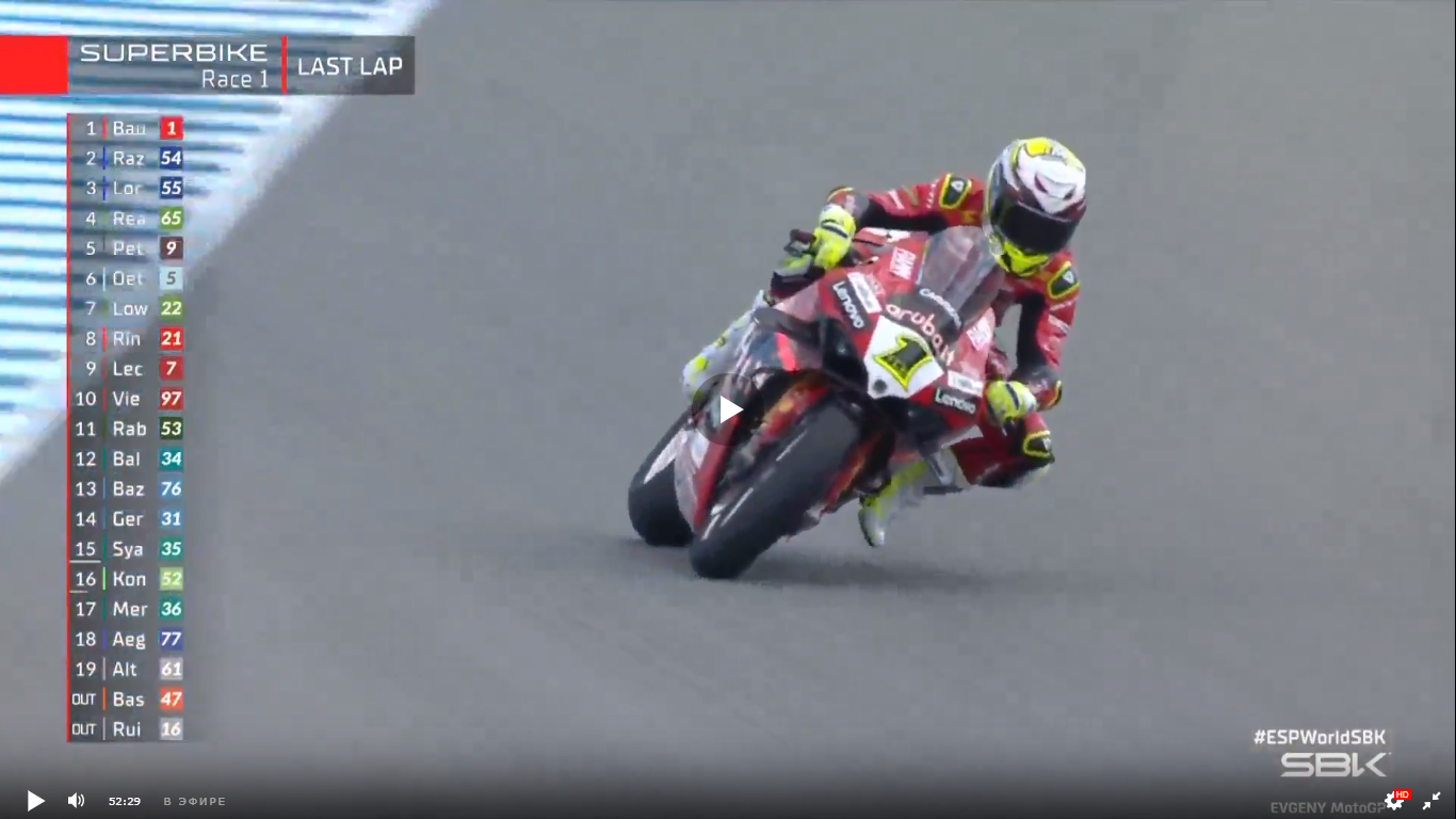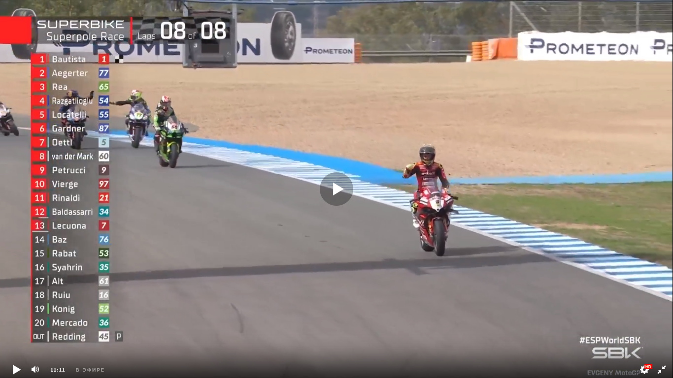 WSBK. Испания, Херес. Очередная гонка, которая могла досрочно определить чемпиона мира. Для этого Альваро Баутиста было достаточно финишировать на 14-м месте. Но делать так Баутиста явно не собирался. Стартовав с первого места, он сразу стал потихоньку отъезжать от конкуренов.