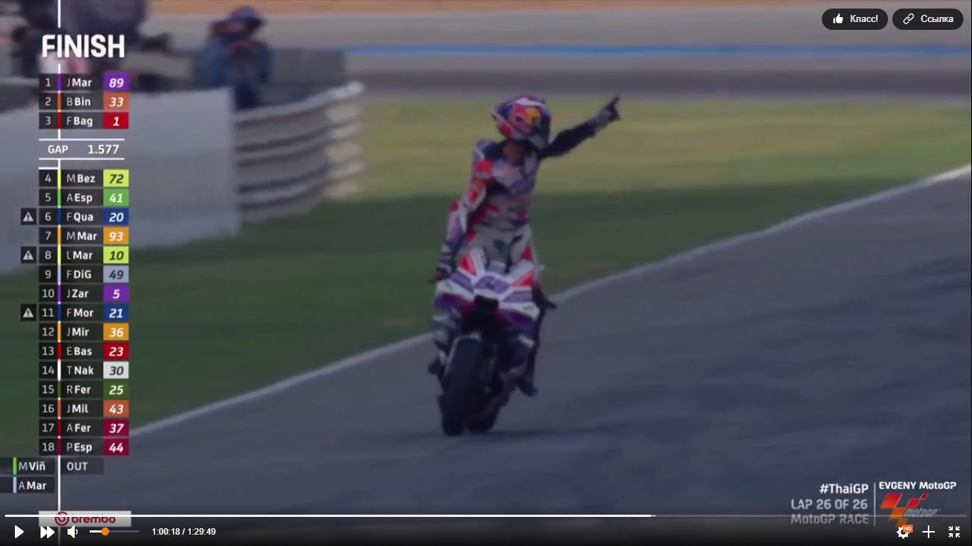 За второе место развернулась борьба между Лука Марини (VR46 Ducati) и Брэдом Биндером (заводская KTM), из которой вышел победителем именно представитель KTM.