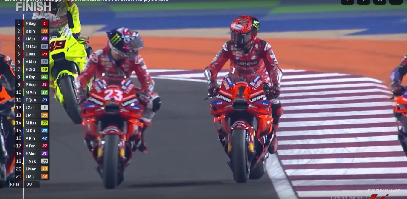 Спринт выиграл Хорхе Мартин, без вариантов. А вот сзади шла борьба на всех позициях, начиная с третьей. Баньяйя довольствовался лишь четвертым местом, уступив третье в конце предпоследнего круга, Алейшу Эспаргаро (Aprilia Racing). Вторым приехал Бред Биндер на KTM.