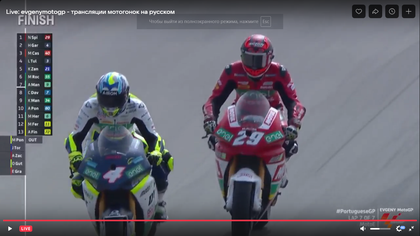 Вторым ехал почти до самого финиша Маверик Виньялес, но его подводит мотор! Таким образом, второе место занимает Энеа Бастианини, а Акоста становится третьим. Что очень хорошо для новичка в старшем классе.