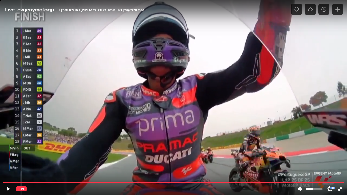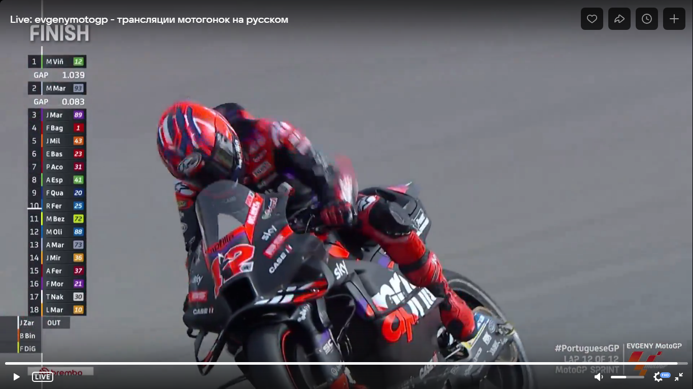 Воскресная гонка сложилась для многих не очень удачно. Начнем с того, что Баньяйя не смог атаковать за лидерство и бОльшую часть гонки держался на 4-м месте. Пока...его не объехал новичок Педро Акоста (GAS-GAS). Ну, а после Баньяйя жестко сцепился с Марком Маркесом. И оба падают... Лидером от начала до конца гонки был Хорхе Мартин.