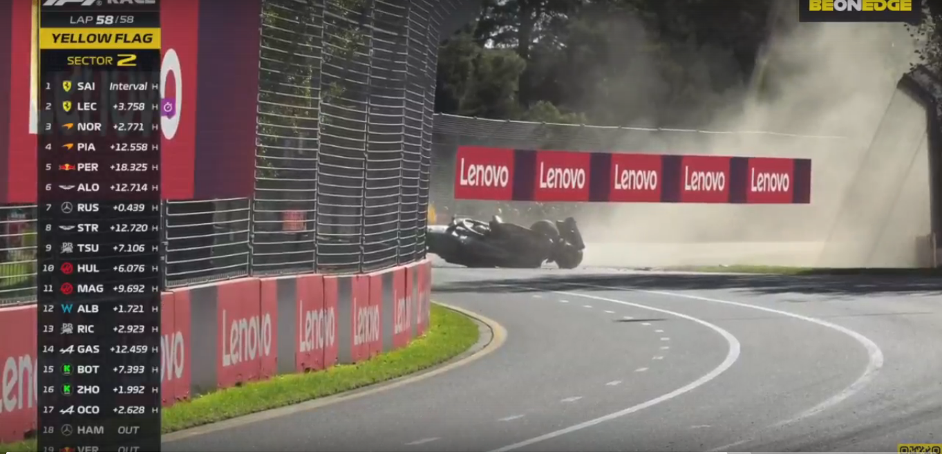 Второй болид Mercedes тоже не добрался до финиша. Но тут ошибка пилота: Рассел разложил свой болид на последнем круге гонки, которая из-за этой аварии завершилась под желтыми флагами.