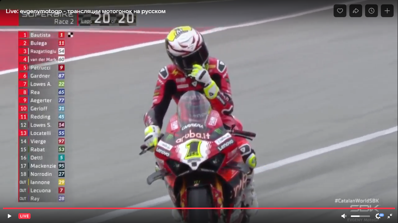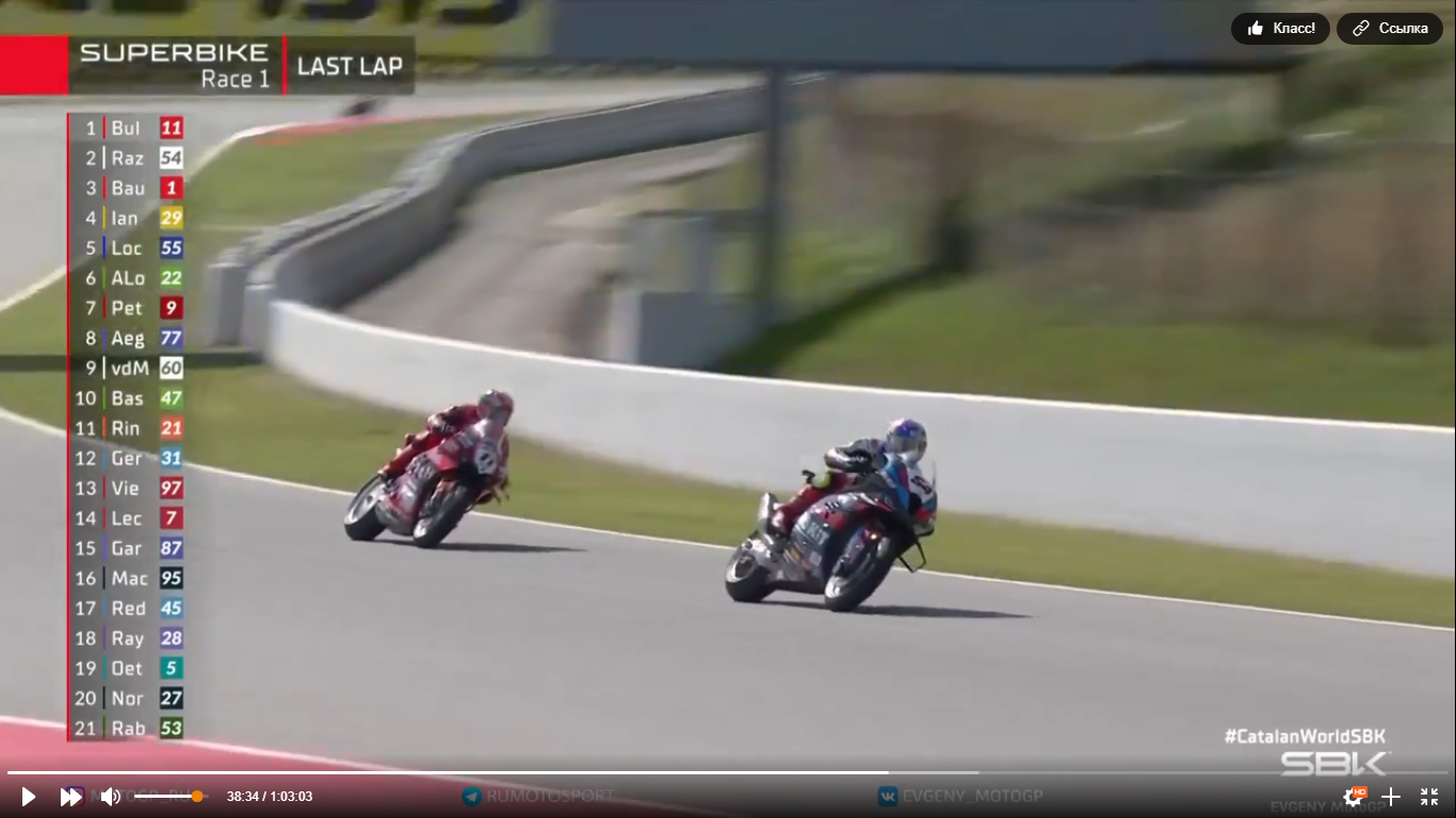 БОльшую часть гонки лидировал Булига на Ducati, но явно не рассчитал ресурс покрышек, что и привело к тому, что на последнем круге уступил победу. А вот Альваро Баутиста крайне плохо выступил в квалификации. С учетом пенализации, он стартовал с 14 позиции. Но пробился на третье, что отличный результат.