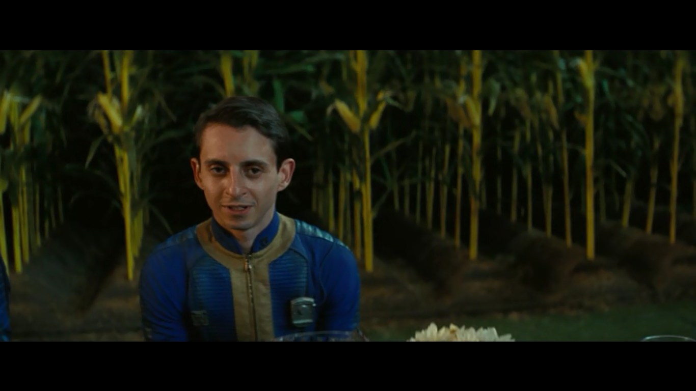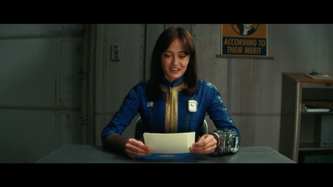 Сама Люси, в духе игры, перечисляет свои "скиллы" перед своим замужеством. Тут стоит сказать, что в угоду сценария, структура самих Убежищ претерпела изменение (по крайней мере, в сравнении с последними играми). Убежища 31, 32 и 33 соединены внутренними герметичными тоннелями. Жизнь в них обособлена, но для "генного разнообразия", между жителями заключаются браки (не выходить же замуж за троюродного брата). И вот этот момент нам и показывают. Таким образом, нас вводят в "курс дела". Но "свадьба" с представителем Убежища 32 протекает не по плану: жителями оказались пришельцы из Внешнего мира, которые устраивают тут тарарам и похищают отца Люси. Руководила бандитами женщина по имени Ли Молдавер (Сарита Чоудри).