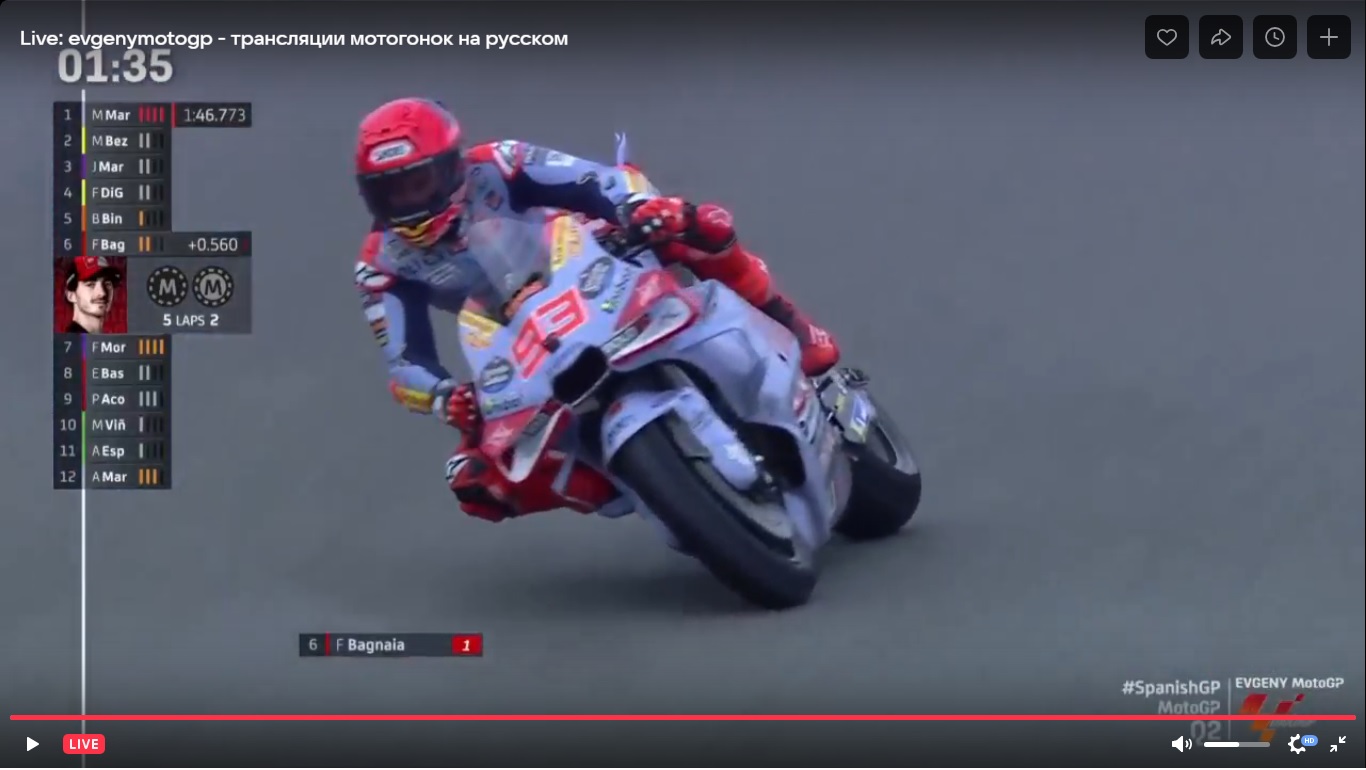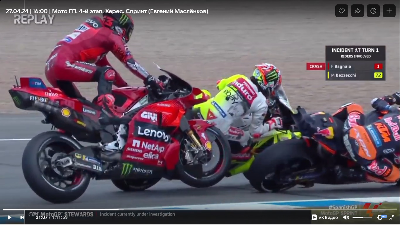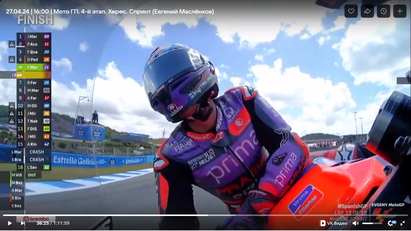 MotoGP. Испания, Херес. Легендарная трасса мотогонок. Предквалификация в самом конце изобиловала падениями. Наверно, одна третья всех пилотов побывала в гравии и на асфальте... Рекорд трассы обновил Франческо Баньяйя, продемонтрировав амбиции на новый титул. Очень хорошо ехала и Aprilia в лице победителя прошлого этапа Маверика Виньялеса. Но... Но квалификация проходила в совершенно других условиях, на мокрой трассе! И Aprilia ничего не смогла показать. Да и вообще, был небольшой хаос в результатах, ибо к концу сессии трасса стала подсыхать. На втором месте совершенно неожиданно квалифицировался Марко Беццекки на незаводской Ducati команды VR46. Но лучшее время успел показать Марк Маркес на утеху местных болельщиков! Именно он будет стартовать с поул позиции.