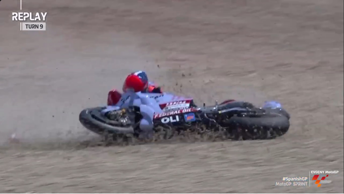 Потом разгорелась жаркая борьба за лидерство между Хорхе Мартином и Марком Маркесом. Маркес оказался немного проворнее и обошел противника. Но не надолго... Он падает!