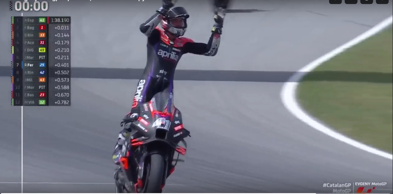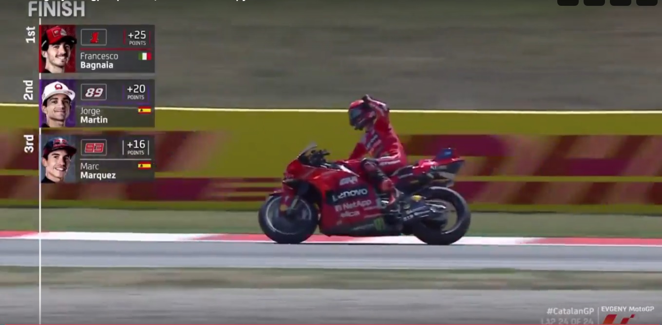 После стал понемногу отрываться. А позади, кипела борьба за третье место. И в группе Эспаргаро, Фернандес, Маркес, именно Марк Маркес оказался быстрее. Несмотря на покрышки софт, он обошел обе Aprilia и занял третье место. На подиуме три Ducati от разных команд. Франческо Баньяйя был несказанно рад победе.
