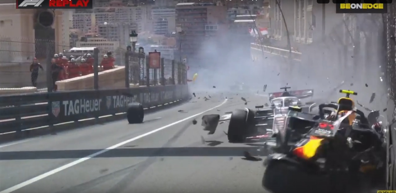 А чуть позже происходит очень серьезная авария из трех болидов (пара HAAS и Red Bull). Причем от Red Bull Переса остался только кокпит...